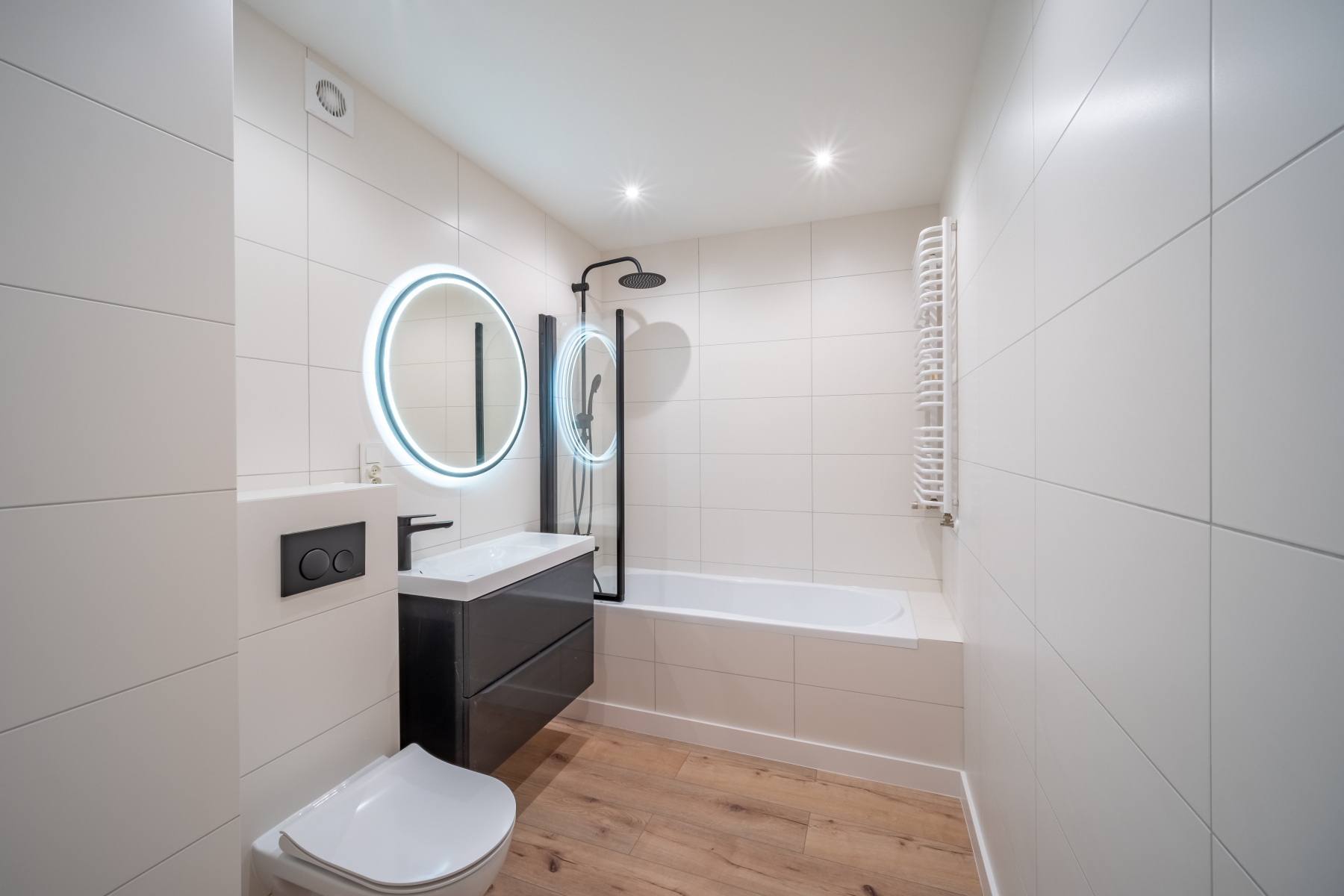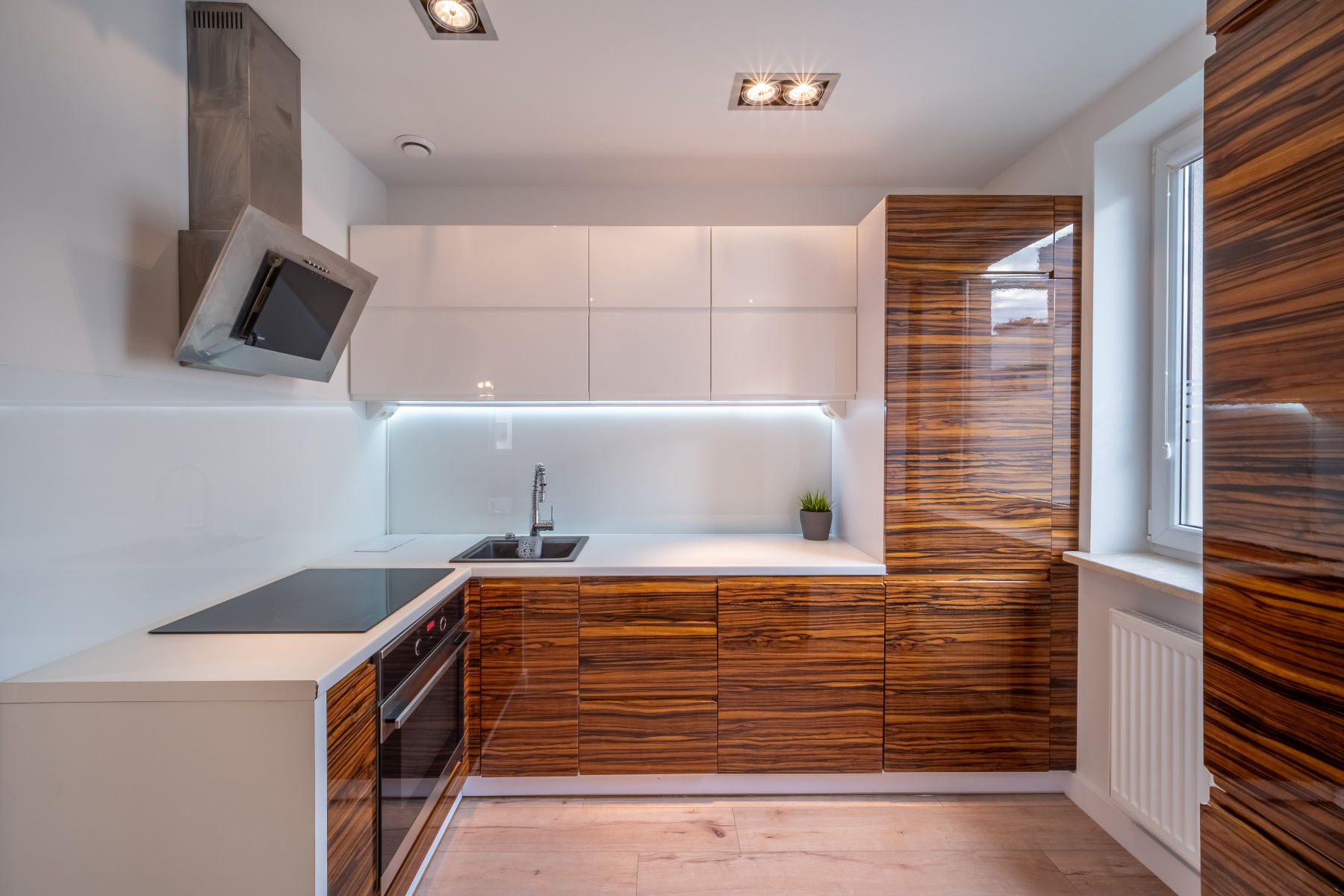 - Kuchnia z zabudową meblową oraz sprzętem AGD (płyta indukcyjna, lodówka, piekarnik elektryczny, zmywarka, okap, zlewozmywak).